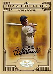 |  2008 Donruss Threads Bob Feller Baseball Americana Autograph Serial Numbered #005/100 Price: $25.00 | 2008 Donruss Threads Ferguson Jenkins Diamond Kings Autograph Serial Numbered #095/100 Price: $25.00 | 2008 Donruss Threads Bobby Doerr Diamond Kings Autograph Serial Numbered #151/250 Price: $15.00 |